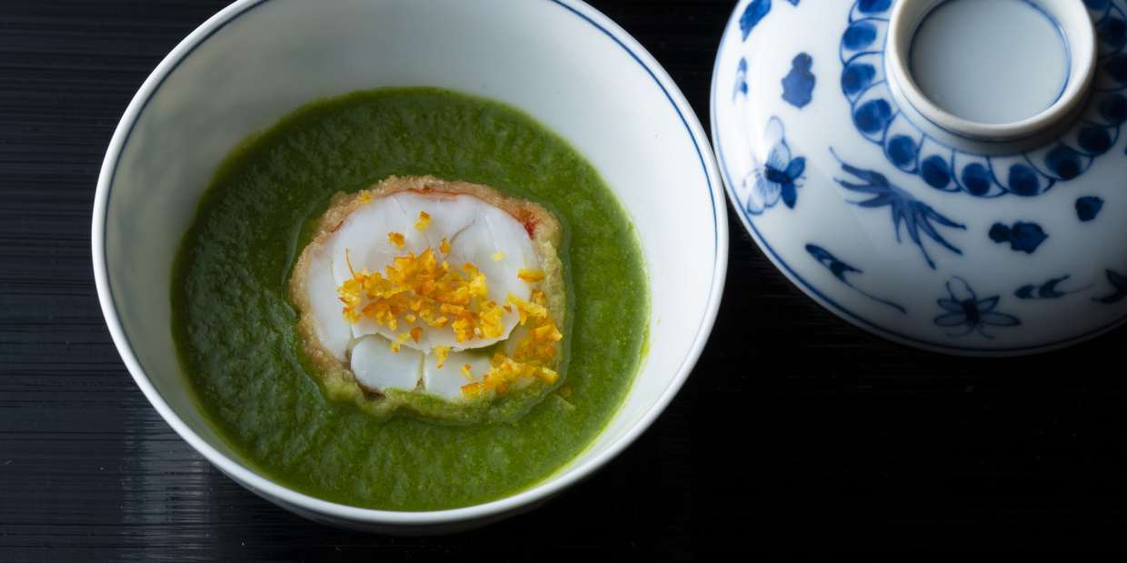 菜の花のすり流し 伊勢海老の餅粉揚げ——菜の花の鮮やかな緑色とレモンの黄色で春らしい一品に