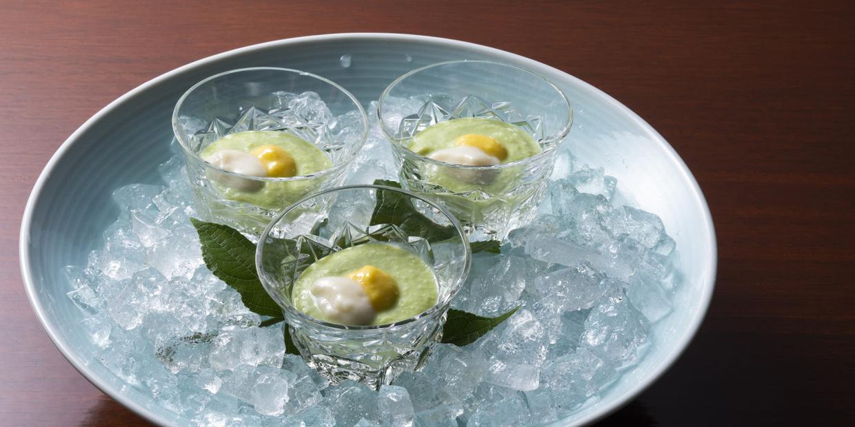ガラスの器に盛ることで、涼やかに。写真右のように、氷を張った器に梶の葉を敷き、すり流しを入れた器を並べるのも夏らしい演出。
