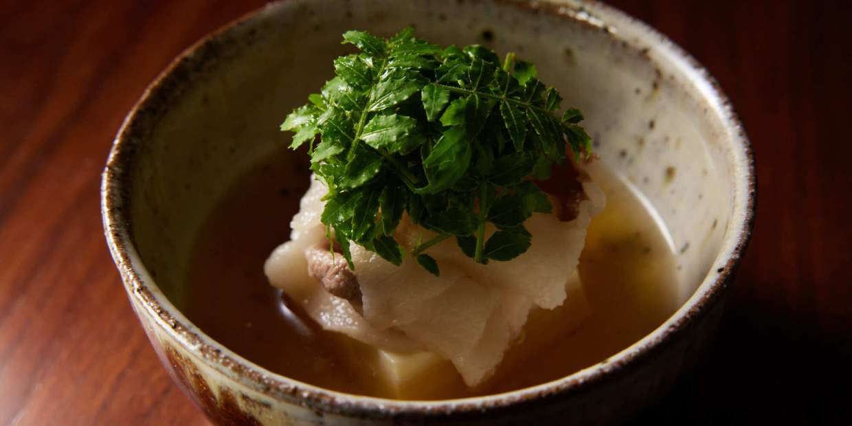 妙趣ある唐津焼から磁器まで、とても一人の作品とは思えないほど、バラエティ豊かな作風。佐賀県伊万里市に窯を持つ塩鶴るりこさんの巧みな手法には驚くばかりです。何と言っても料理を盛り込みやすく、しかもリーズナブルなお値段なので、料理人に人気が高いと言います。『神楽坂 石かわ』の石川秀樹さんも、「安心感があるので、料理のインスピレーションが湧く」と絶賛。早速、石川さんの使い方を拝見します。