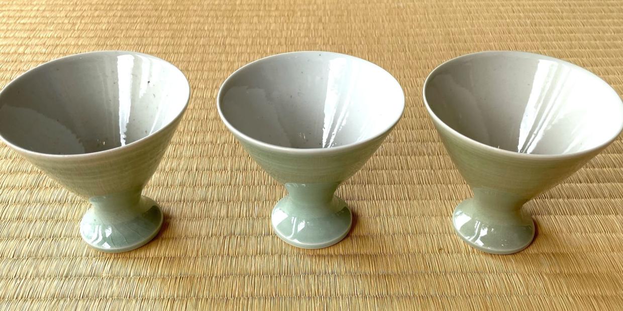 工房の職人たちによって完成したカップは、手触りはあたたかく、色ムラ、細やかな貫入が味わい深い。煎茶杯に脚がついたような独特の形だ。茶杯の広がりは茶の香りを立たせるためのものだが、その働きをお酒のうつわに生かした。これでワインを飲むとグラスより、香りもふんわりと広がると好評だ。