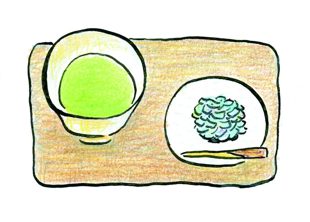 粒餡よりこし餡が上等とされているから、主(おも)菓子はたいていがこし餡。僕は粒餡も美味しいと思うけど、お抹茶を飲むために作られたお菓子なんで、小豆の味がする粒餡より甘いだけのこし餡がええらしいわ。肝心なんは適度な甘さと、季節を表現する色と形。いかにイマジネーションできるかが大事なん。白い上用にピンクがぽっとあったら吉野山の桜を思い浮かべ、水無月が出てきたら夏越(なごし)の祓(はらえ)やなあてね。でもよく見る外郎(ういろう)でできた水無月は餅菓子。菓子司は葛で作ってはって、上菓子になる。そやから茶席にイチゴ大福なんてもってのほか。出てきたら、「何やこれ」てなるね。