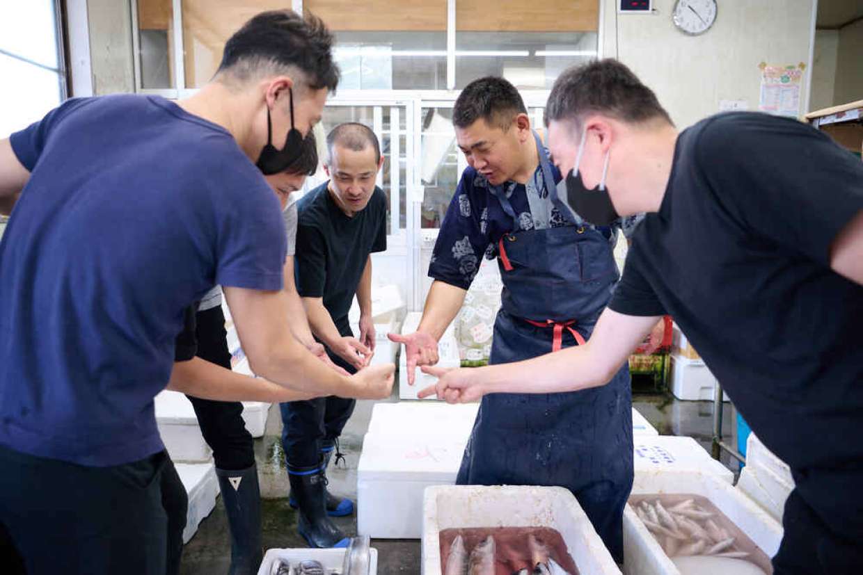 右から2番目が『サスエ前田魚店』前田尚毅(なおき)さん。右から、イノベーティブ『シンプルズ』井上靖彦さん、『茶懐石 温石(おんじゃく)』杉山乃互(だいご)さん、『日本料理FUJI』藤岡雅貴さん、天ぷら『成生』志村剛生(たけお)さん。全員、前田さんの魚を使うメンバーだ。写真は、いい魚を取りあう、毎日恒例のジャンケンの模様。