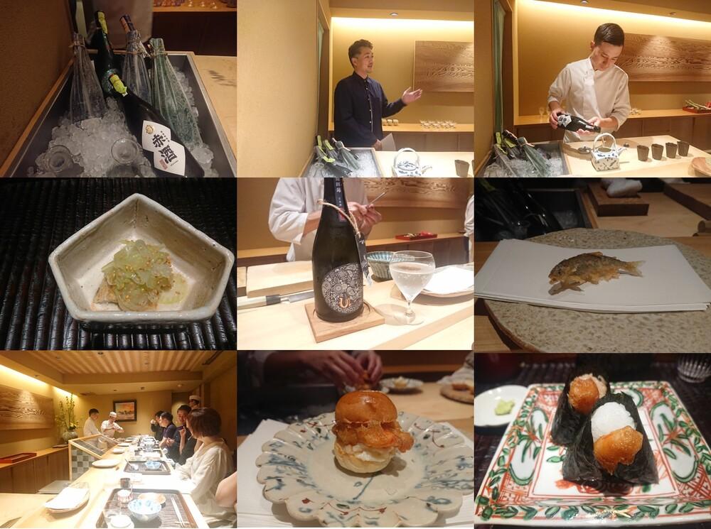 上段左から、熊本『花の香酒造』の日本酒「産土(うぶすな)」と赤酒。/『花の香酒造』の神田清隆社長。34歳の若さで蔵を継ぎ、短期間で酒質を向上させ、「花の香」(2015年リリース)や「産土」(2021年リリース)で日本酒業界の注目を集める。/天ぷら『ぬま田』の沼田和也さん。中段左から、赤酒を合わせ酢に使ったうざく。前菜として提供。/「産土」はたっぷりと注がれた。/落ち鮎は、泳いでいる状態で披露され、天ぷらに。下段左から、会の様子。神田社長も天ぷらとのペアリングを堪能。/赤酒をタレに使ったエビ天バーガー。/ご飯物も充実。天丼や天茶、天むすなど5種から選べる。