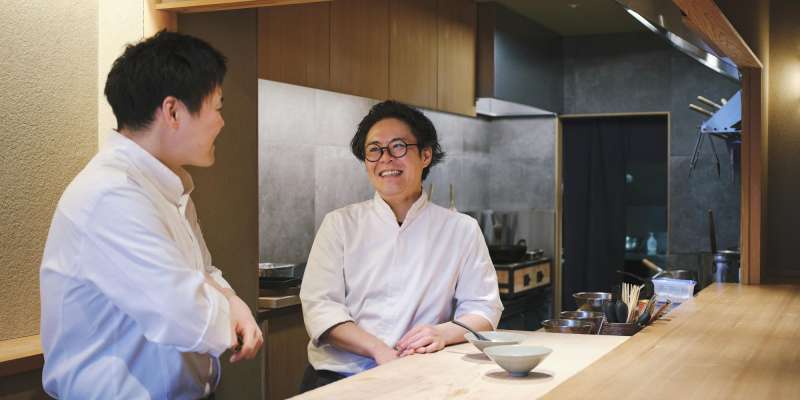 宮下 司さん:1985年三重県生まれ。幼少期より料理に親しみ、高校卒業後は「辻󠄀調理師専門学校」へ。卒業後、京都『祇園 丸山』では常に学び続ける姿勢と研ぎ澄まされた美意識を培い、『祇園さゝ木』では“攻め”の料理とお客を楽しませる対話力を学んだ。16年にわたる研鑽を経て、2021年11月に独立。開業直後から満席が続く予約困難店となる。現在は通常営業に加え、コラボレーションイベントや料理教室、行楽弁当の販売(※夏季を除く)などにも意欲的に取り組み、お客を楽しませながら自身の表現の幅を広げている。
