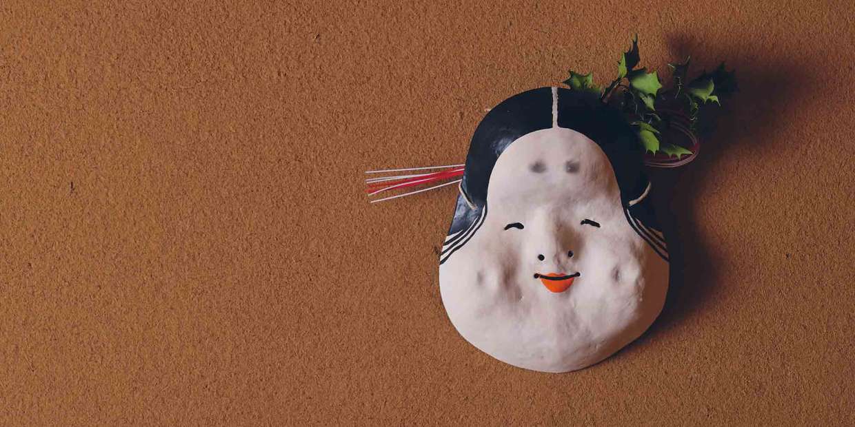 カウンター席へと進むと目に入るのは、穏やかな微笑みを浮かべる福の神の面。