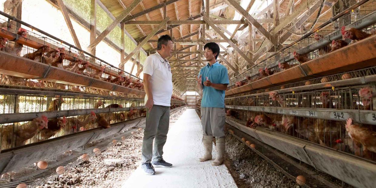 「1棟に約20万羽という大規模な鶏舎も多くて。卵をコンベアで回収できたりと、一人で養鶏ができるように工夫もされているんですよ」。