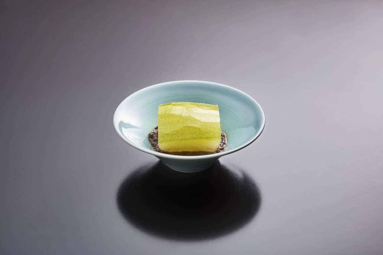 たっぷりだしを含ませて、キンと冷やし、清涼感たっぷりに供するのが、夏の冬瓜料理の醍醐味です。北新地の割烹『さか本』では、先代・坂本靖彦さんの頃から冷やし風呂吹きが定番でした。冬瓜は繊細な風味や食感を生かすよう、下茹でしてから浸し地に漬けて味を含ませます。きれいな皮目の黄緑色を生かすため、鶏味噌を敷いた上に冬瓜を盛り、あしらいはなし。その潔い仕立てを生かすのが、鶏味噌のなめらかな歯ざわりです。今回は、浪速割烹らしい味本位な夏の一品を、動画で大公開。細やかなコツに注目を!