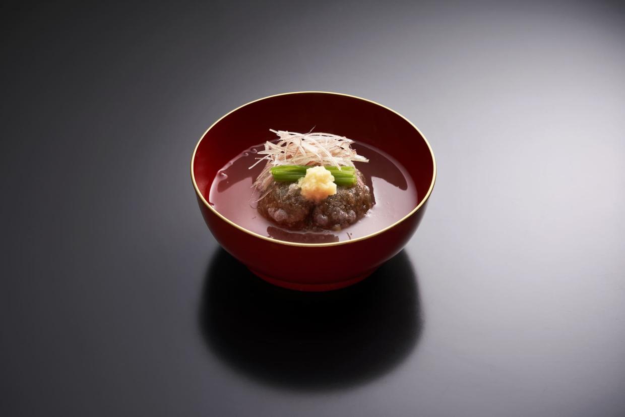⑨ 鍋にカツオ昆布だしとエビだしを1:1で合わせ、温める。淡口醤油・濃口醤油・みりんで味を調え、水溶き吉野葛でとろみをつける。
