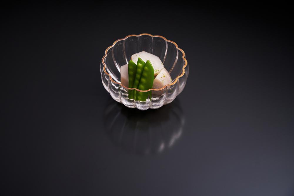 - うつわに⑤を盛り(大きければ半分に切る)、少し煮汁をかける。振り柚子をし、塩茹でした絹サヤエンドウをあしらう。