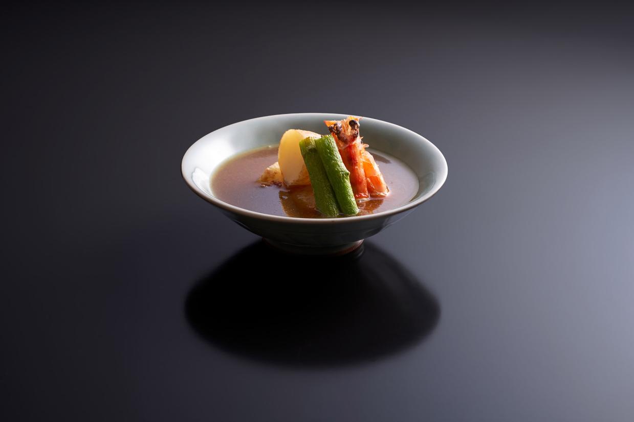新ジャガを下茹でしておけば、注文が入ってから車エビ、アスパラガスと共に揚げ、作りたてのカレーあんを敷いた上に盛り合わせるだけ。今回、動画でご紹介するのは、5分もあれば出来上がる割烹らしい一品です。「カレーあんに加えた“かえし”が味のポイント」と坂本靖彦さん。手打ち蕎麦を提供する北新地の割烹『さか本』では、つゆに使うかえしを常備。そのまるみがあんの味に奥行きを与え、カレーのスパイシーさを際立てます。