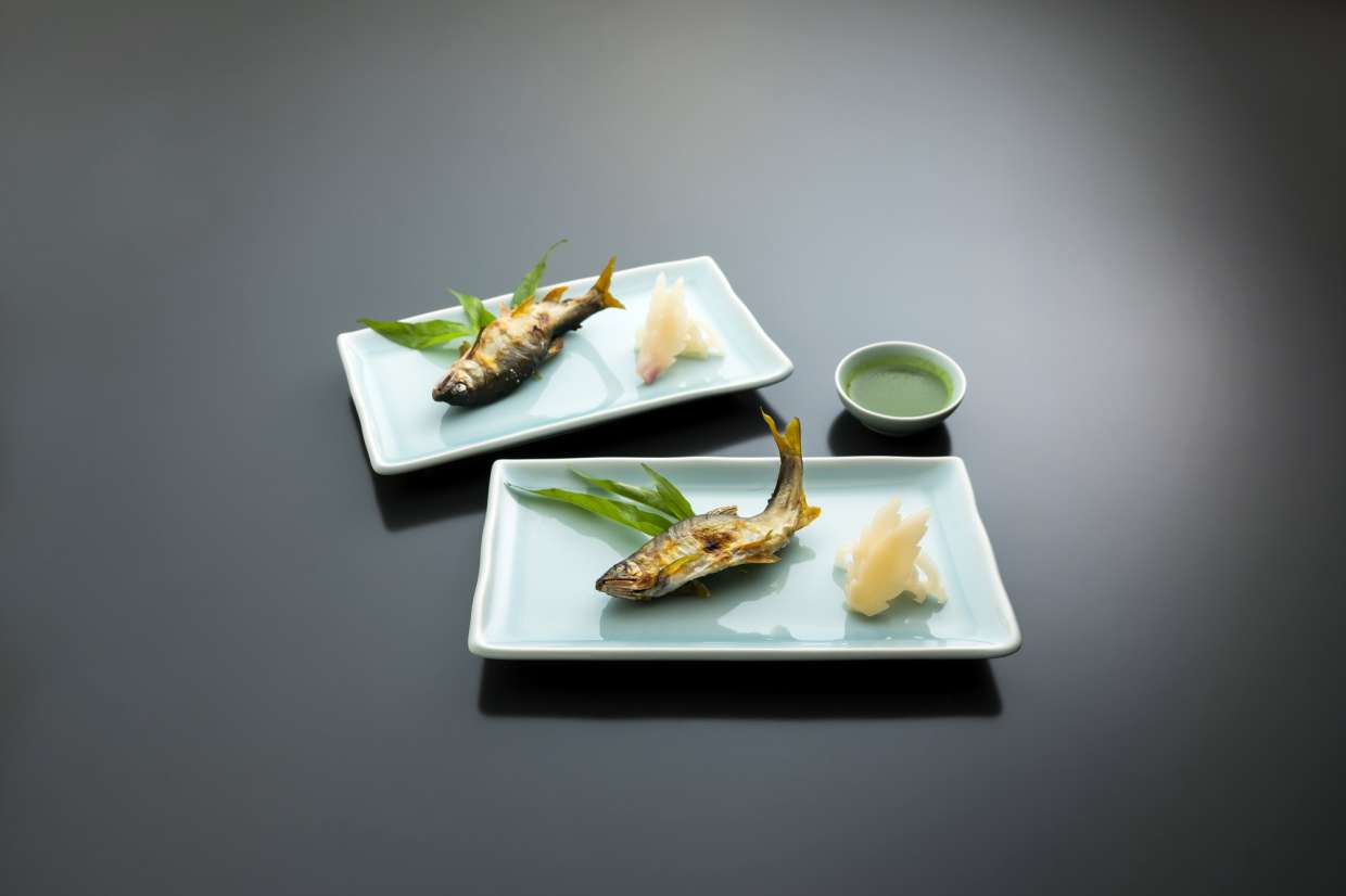 バックヤードに設えた淡水の水槽には鮎が泳ぎ、注文が入れば、生きたまま調理する。大阪・北新地の浪速割烹『さか本』では、次男がカウンターに立つ今もこのスタイルが貫かれています。始まりは30数年前、元大将・坂本靖彦さんが鮎釣りに目覚め、釣り仲間や産地の方々と太いパイプを築いたことから。以来、解禁日からシーズンが終わるまで、週に一度は奈良の川へ。鮎料理は『さか本』の名物となりました。自分や仲間が釣り上げた鮎だからこそ、鮮度のよさを生かした丁寧な仕事で調理したい。そんな坂本さんの想いは、定番の塩焼きにも表れています。焼きムラがなく、ヒレや尾まで美味い、秘伝の『さか本』流鮎の塩焼きをご紹介します。