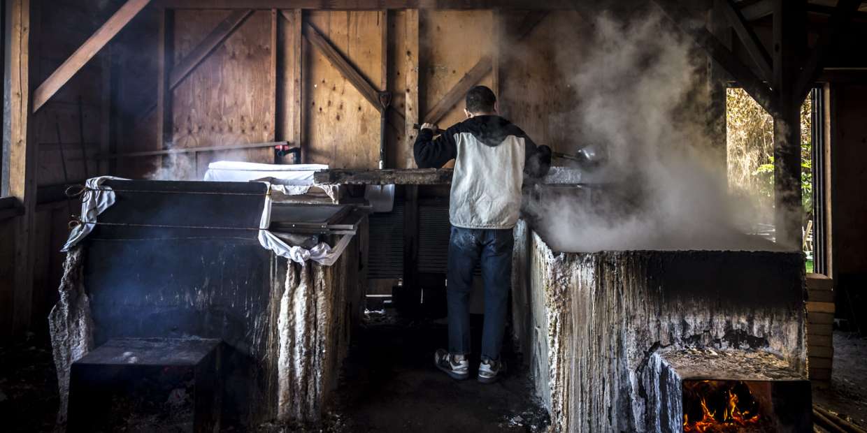 2022年末に新設した工場へ足を踏み入れると、凄まじい熱に圧倒される。薪火の炎がメラメラと立ち上り、2台の大きな鉄釜がグラグラと煮えたぎっている。