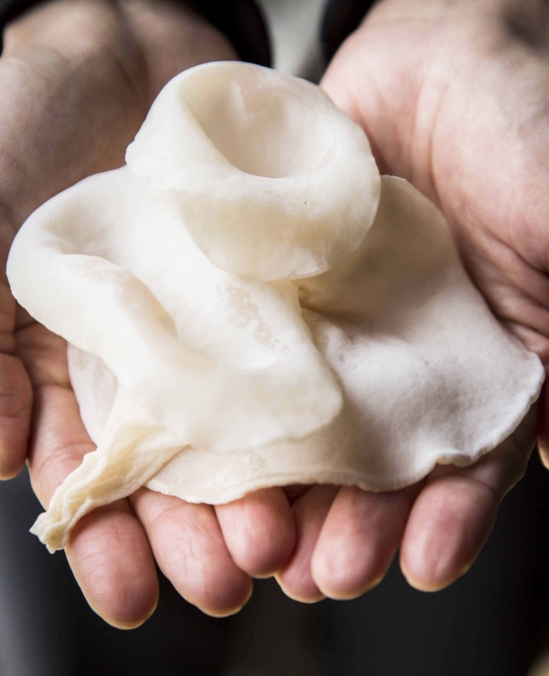 収穫されたばかりのキクラゲは、透き通るように真っ白で表面はしっとり。肉厚のボディはグミのようにプルプルで弾力もしっかりしている。