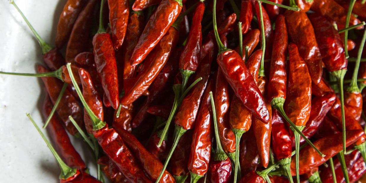 左から本鷹(ほんたか)、三鷹(さんたか)、鷹の爪、天鷹(てんたか)、益都(えきと)。本鷹、三鷹は鷹の爪と同じく日本生まれ。鷹の爪に比すれば柔和な辛みだが、共にバランスが取れた味わいで用途も幅広い。益都は糖度が高く、キムチによく使われる品種。