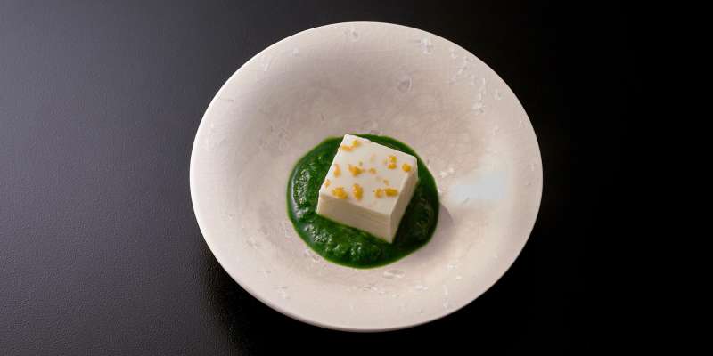 『柏屋 大阪千里山』松尾英明さん作・カリフラワーとマカダミアの豆腐 春菊のすり流し