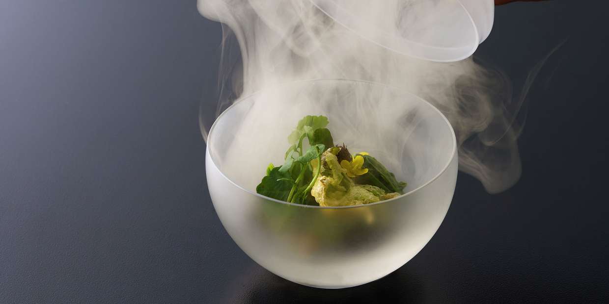 うちのコースは、二十四節気をテーマに仕立てています。2月半ばからは「雨水(うすい)」。その時季の七十二候に「霞始靆(かすみはじめてたなびく)」があります。そこで今回は、春の野山に見立てた料理に、燻煙の霞をまとわせてみました。