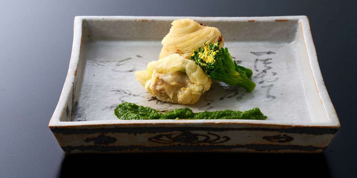 『法善寺 浅草』の辻 宏弥さんは、中国料理のパイ生地に初挑戦。ラードを使った水皮と油皮を合わせた生地は、揚げるとサクサクの軽やかな食感になります。“包む”というテーマに沿って、ハマグリ形のパイ生地の中には、ハマグリの葛豆腐を。酒蒸しした地を太白ゴマ油で乳化させてから葛でゆるく練り、とろっととろけ出る食感を工夫しました。菜の花ピューレには、ニラの香味を利かせて。大阪料理らしい遊び心と、汎用性の高さが大好評でした。