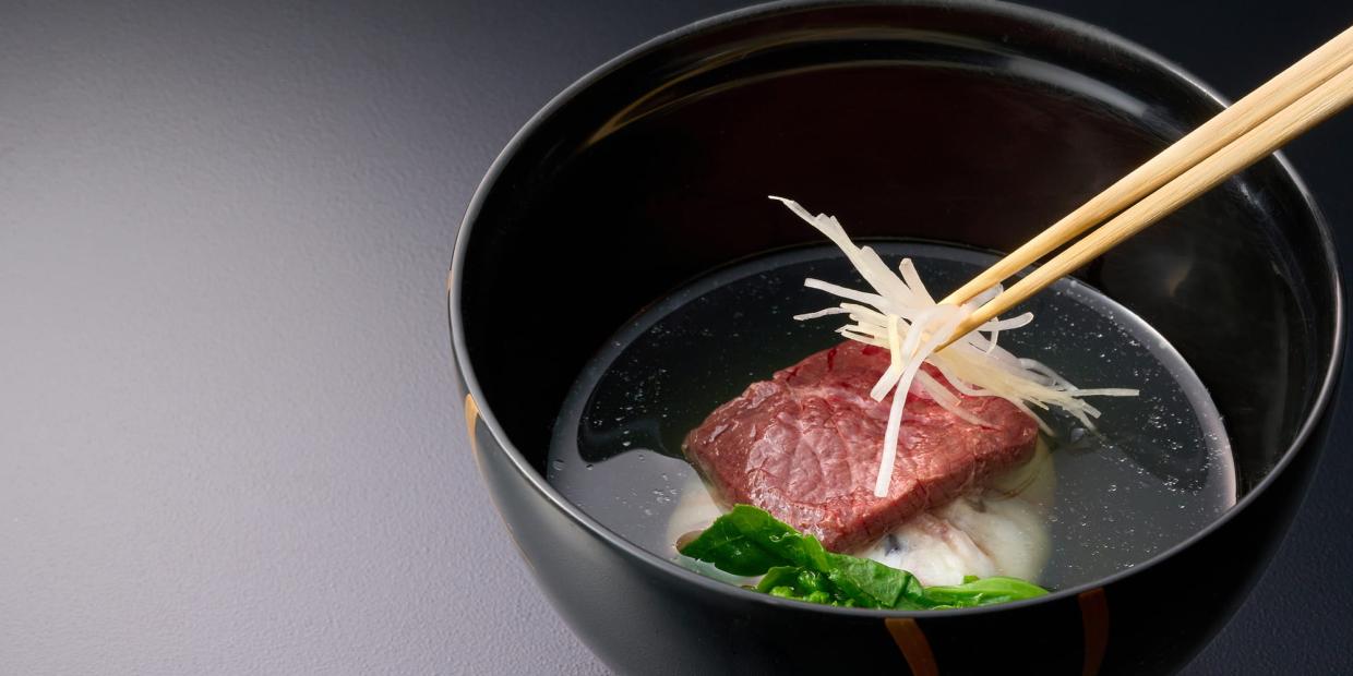 真薯の上には、ニタリクジラの赤身を霜降りして一切れのせました。昨秋、35年ぶりに大阪市中央卸売市場でニタリクジラの生肉が取り引きされたのですが、その赤身を食べてビックリ。めっちゃ美味しかったんです。
