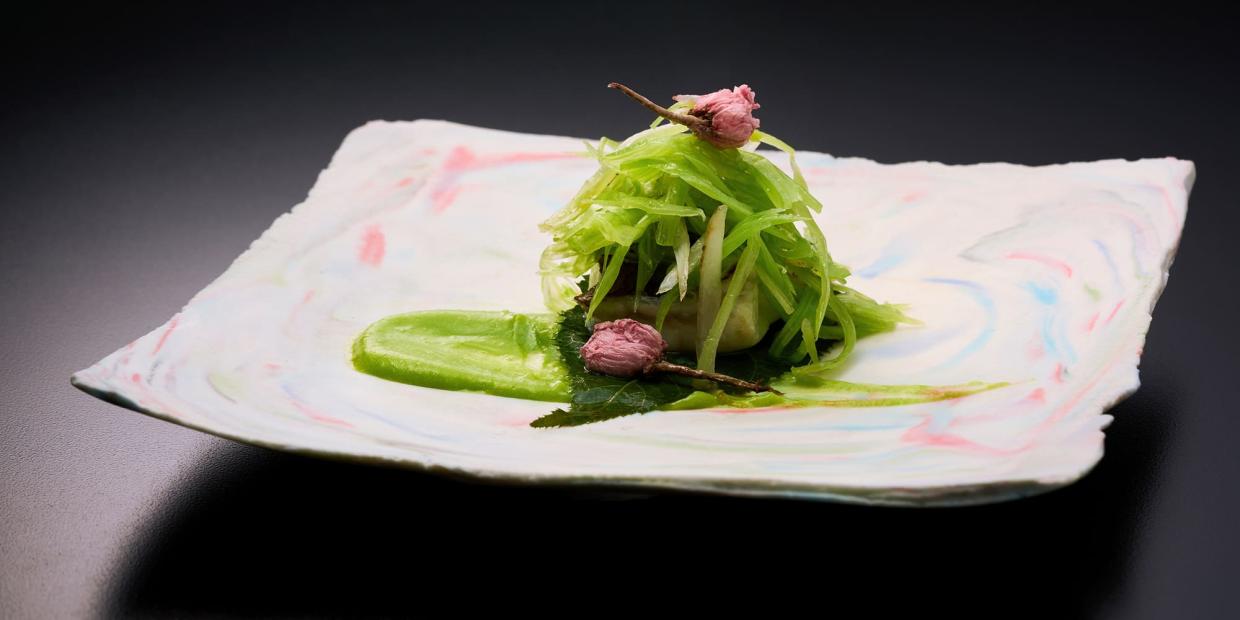 桜の葉の塩漬けを使って桜鯛を塩〆し、花の塩漬けをビジュアルのアクセントに。3月の大阪料理会のテーマ食材・桜鯛を春爛漫な一皿に仕上げたのは、西天満の『キュイジーヌ・ド・オオサカ・リョウ』の畑島 亮さん。脂のりが弱い桜鯛をしっとりジューシーに仕上げるため、油でコーティングして保湿。自家製の鴨油を桜鯛にまとわせて下蒸しし、さらに、太白ゴマ油を絡めた若ゴボウをのせて蒸し上げるという技ありの油使いは、串揚げの名手・畑島さんの面目躍如となりました。