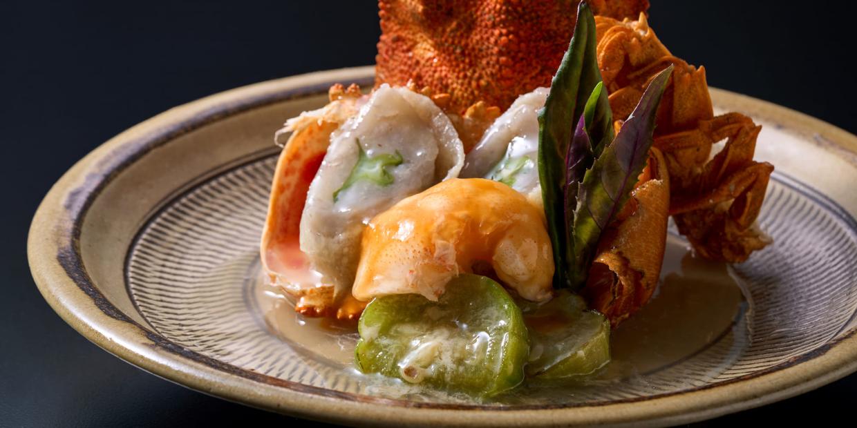 夏の島野菜と豪華なセミエビを使って、割烹らしい一品を考えてみました