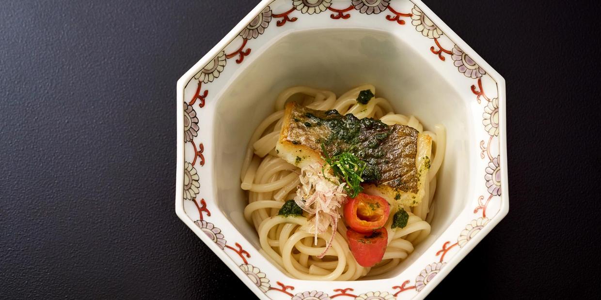 未利用魚の利用促進などの漁業支援も行っている東天満『懐石料理 雲鶴(うんかく)』の島村雅晴さん。7月の発表はSDGsがテーマとあって、島村さんが選んだ食材は、故郷・和歌山でもよく網にかかるというアイゴ。市場に出回ることのない未利用魚です。骨でだしを取り、身は具の主役に。ジェノベーゼパスタのイメージで目箒(バジル)の青々しい香りとトマトのフルーティーな酸味に、コシのある半田素麺を合わせて、夏らしい爽やかな一品に仕立てました。