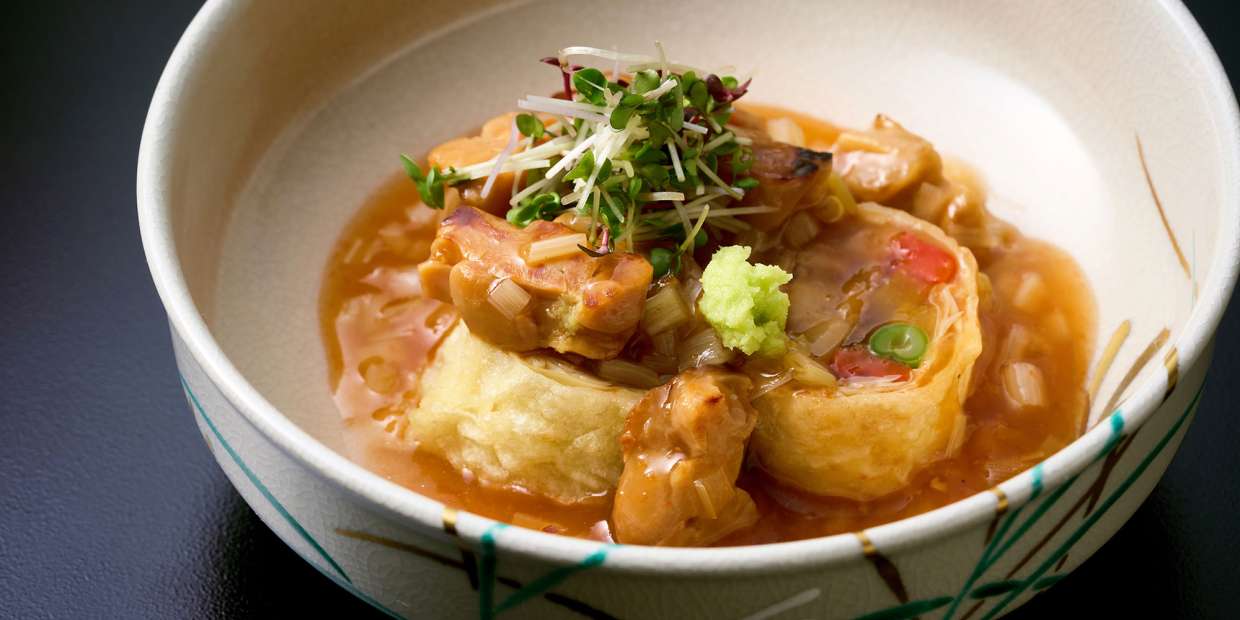 9月末に開催された138回目の大阪料理のテーマは、ヴィーガン料理。アフターコロナでインバウンドが増えた昨今、和食店では大きな課題の一つになっています。カツオだしを筆頭に、魚介も肉も卵も使えないという制約の中、東心斎橋の割烹『旬鮮和楽 さな井』さんが取り入れた素材は、代替肉としても注目を集めるインドネシア発祥の大豆発酵食品・テンペ。コク深い野菜だしを合わせ、満足度の高い一品を仕立てました。