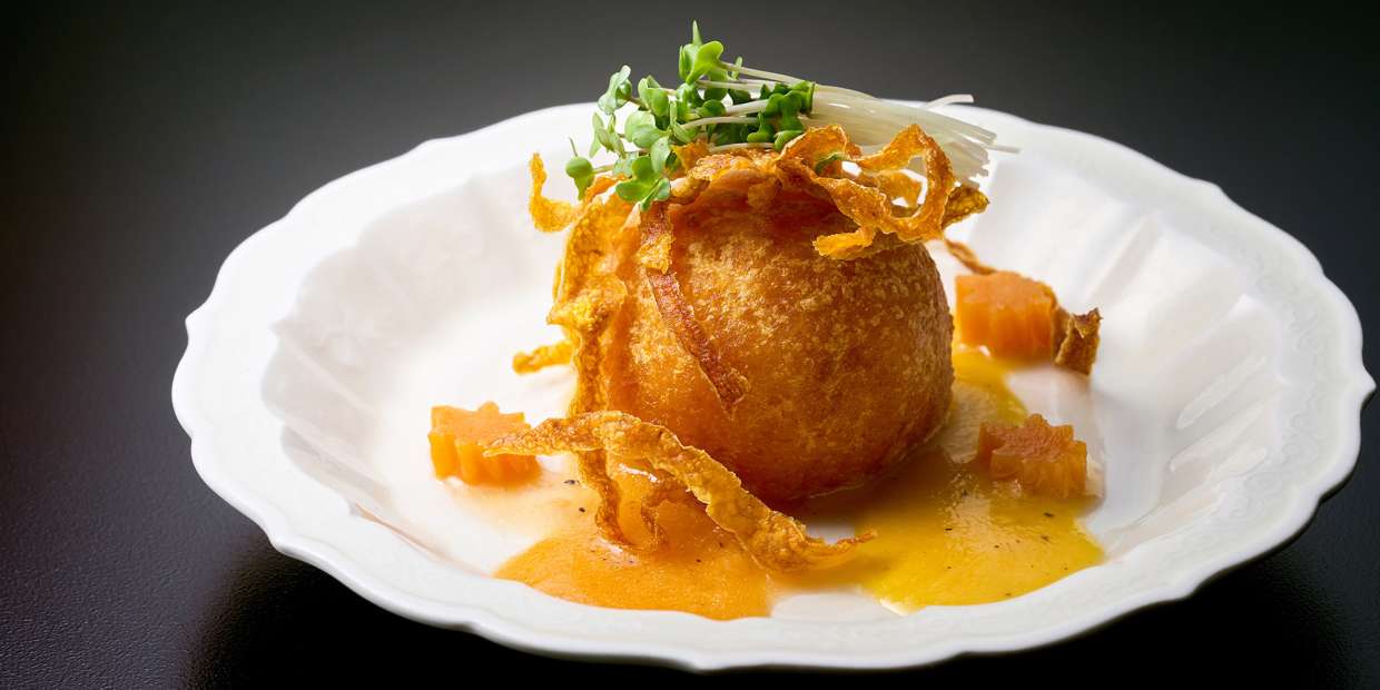 人参饅頭は蒸してから揚げ、仕上げにサラマンダーで焼いてます。その中に、帯状に切ってたて塩に浸した生のニンジンを食感のアクセントに射込みました。あえて味付けをせずに仕上げたので、ニンジンの甘みがぐっと際立っていると思います。