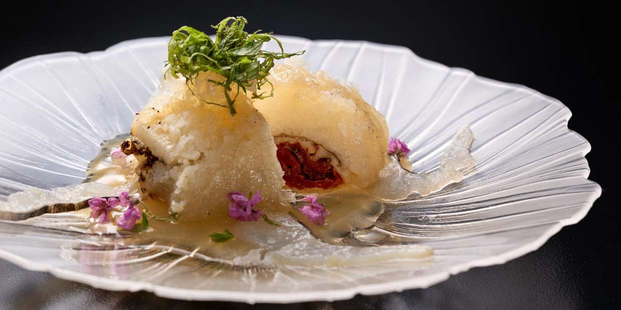左はドライトマトの天ぷらを包んだ鱧のルイベ。右が一枚落とし。