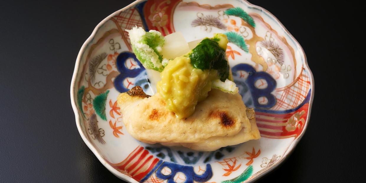 白子は茹でてからピューレ状にして、軽く焼いた干しタラに塗って焼き上げています。銀杏味噌の味で食べていただきたいので、タラも白子も塩分は控えめ。パサつきがちなタラですが、一夜干しにすることでしっとりと仕上がったかな、と思います。