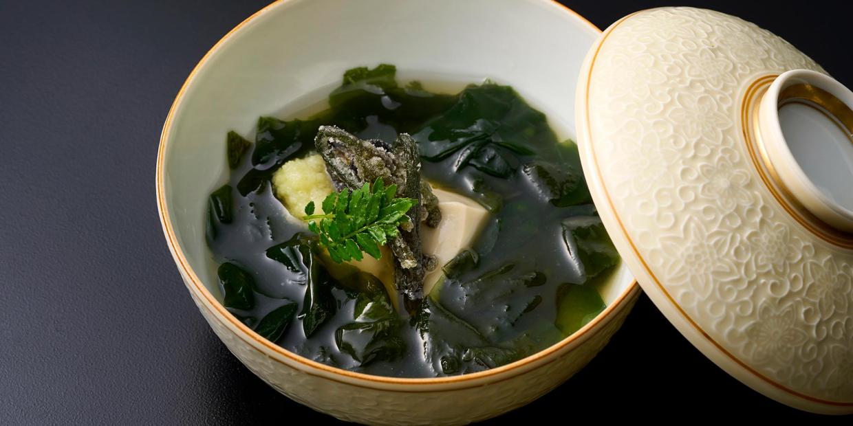 この料理は、春の訪れを感じていただく先付として、小さな蓋物に入れてお出ししていました。ワカメと山菜という今回のテーマにぴったりだったので、ボリュームを増やして一品料理として仕立て直しています。
