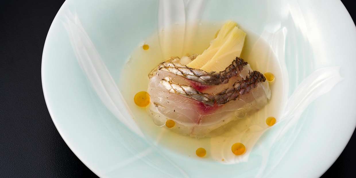 主役の魚は、今が旬の桜鯛。「爽煮」という料理名から連想し、さっと煮るのではなく、焼き霜にして生の状態で盛り、熱々のスープをかけて半生状態で味わっていただく仕立てにしました。
