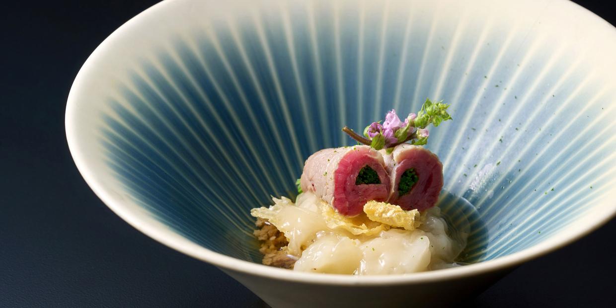 堺で『おおさかもん料理 鮨 守屋』を営む守屋栄一さんは、今回が初の発表。寿司屋のコースの一品として、肉料理を考案しました。屋号に“おおさかもん”と冠するだけあって、主素材に選んだのは、河内鴨と泉州の新玉ネギ。新鮮さが売りの河内鴨のロースは、レアに火入れし、芽ネギを巻いて。“固形の玉ネギスープ”をイメージした寄せ物、しっかりめの味付けのそぼろを合わせ、割りだしでまとめた、“鴨ネギ”のアレンジ版です。