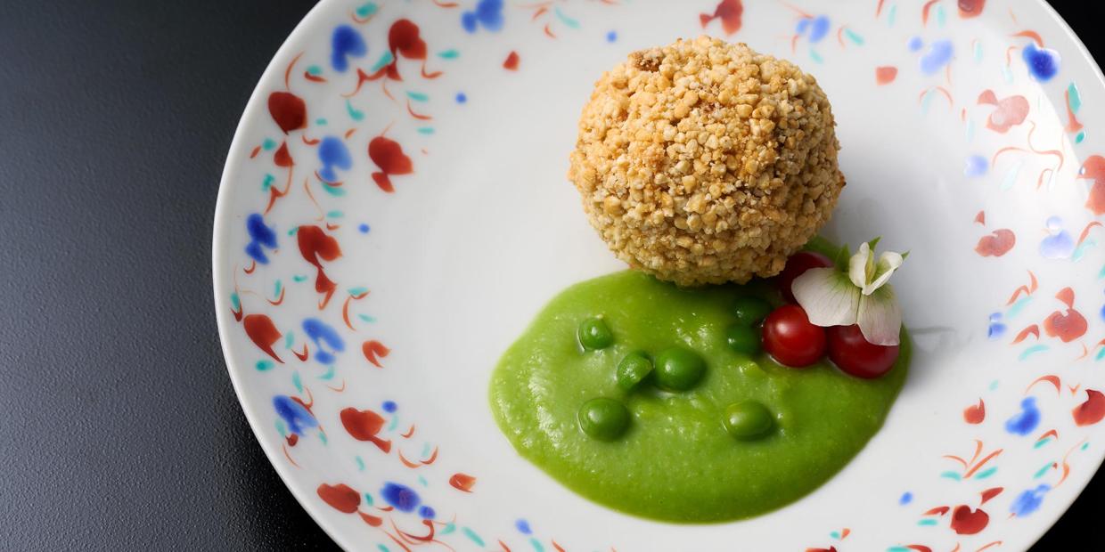 5月末に開催された「大阪料理会」のテーマは、初夏から味がのってくるアジ。「ごちそうプロデューサー」として活躍する料理研究家・広里貴子さんは、アジフライと小籠包をミックスさせた新発想の一品を披露しました。つくねにしたアジに道明寺(どうみょうじ)粉の衣を付けて揚げ、真ん中を箸で割ると…。溢れ出すのは、アジの骨だし+トマトウォーター。目にも鮮やかな碓井豌豆(ウスイエンドウ)のペーストと絡めていただく、初夏の変わり揚げ物です。