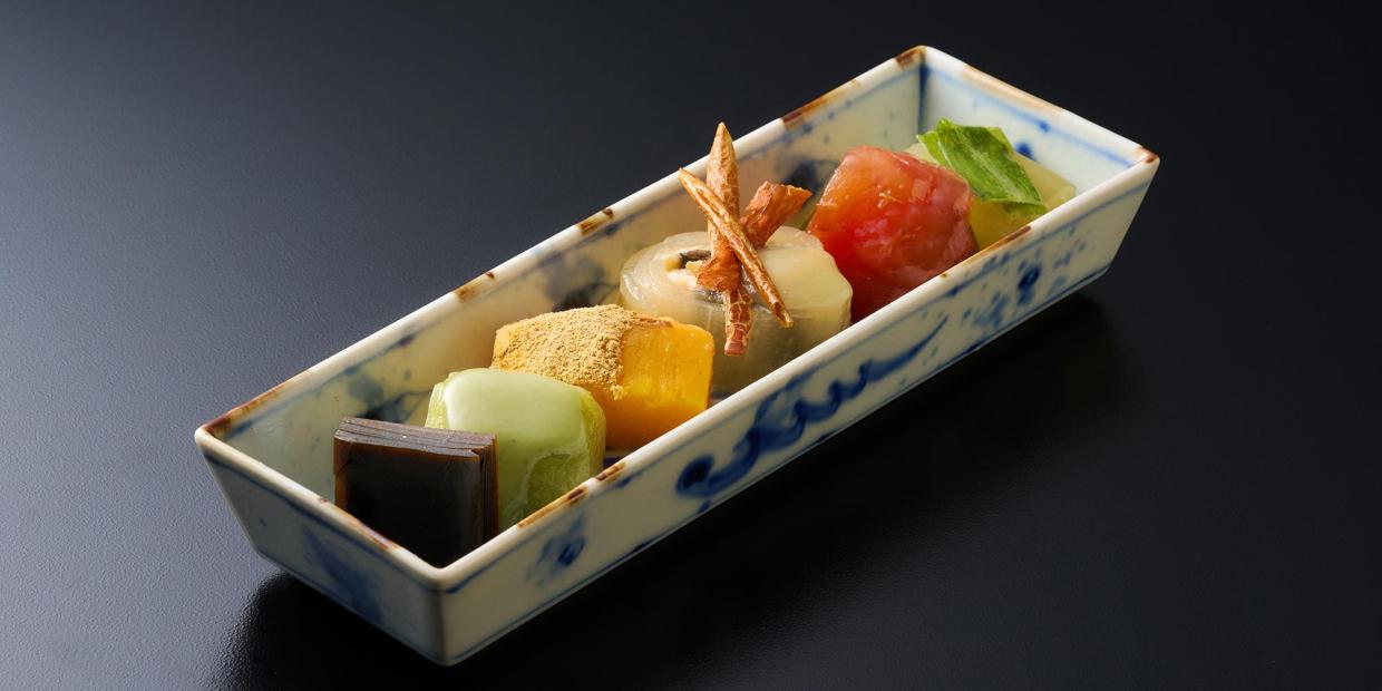 大阪のだしに欠かせない真昆布は、だしがらを昔ながらの仕事で天上昆布に。水ナスは揚げ煮にして鮮やかな緑色を生かしつつ、皮はあんに活用。柔らかな皮を乾燥粉末にして振りかけたのは、なにわの伝統野菜・勝間南瓜(こつまなんきん)。5種の夏野菜は、皮や種も余すところなく使い切っています。研究熱心で知られる吹田の『じょう崎』店主・城崎栄一さんが仕立てた夏の6種盛は、大阪料理らしい“始末の心”が随所に感じられる力作です。