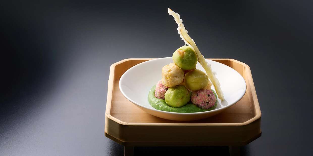 『浪速割烹 㐂川』上野 修さん作・月見団子見立ての揚物四種 大阪菊菜の馬鈴薯ピュレ 鮒ずし風味餡