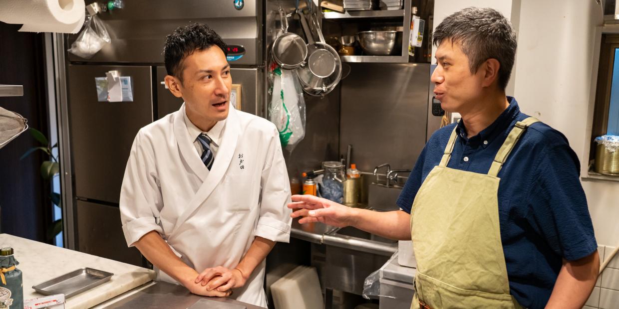 「日本料理のコースの一品としてお出しできる肉料理を学びたい」と話すのは、故郷・奈良で『おか田』を営む店主・岡田直己さん。「最近、スチームコンベクションオーブンを導入し、八寸に組み込むローストビーフを作っていて。もっとブラッシュアップしたいな…と思っていた時に、理想とするローストビーフに出合いました」と、一日限りの研修を志願したのはフランス料理『ラ・フォルム ド エテルニテ』オーナーシェフ・永野良太さん。