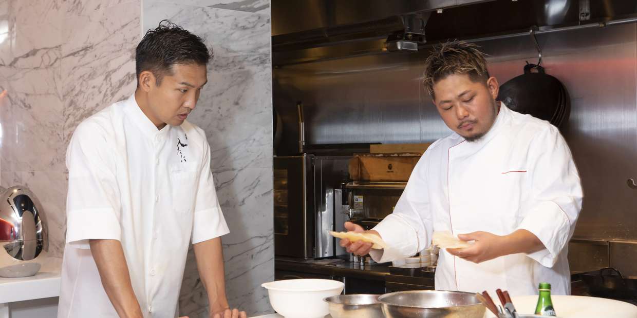 1990年福岡生まれ。大阪のホテルなどで腕を磨いた後、市内の人気中国料理店で料理長を務め、2021年2月に独立。実は料理はほぼ独学で、昆布だしも使えば、北京ダックにフォアグラのアイスと旬の果物も合わせる。ジャンルを飛び越えた自由な感性で注目を集め、オープンから1年半ながら連日満席を誇っている。