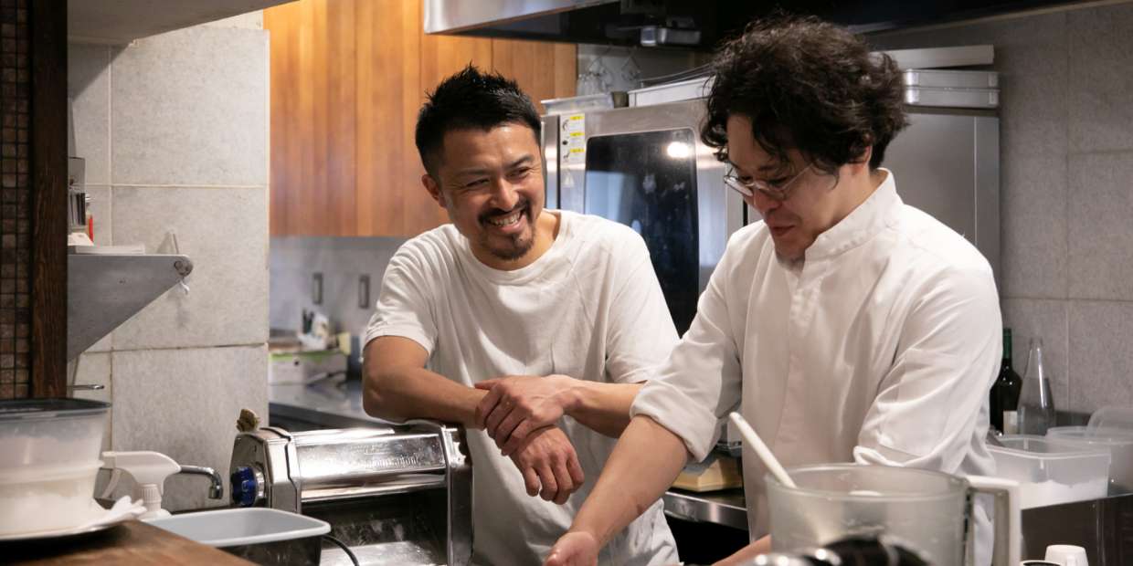「蕎麦ではない印象的な麺を、ずっと探していたんです」と京都の日本料理『ひがしやま 司(つかさ)』店主・宮下 司さん。自ら指南役に仰いだのは、京都を代表するイタリアンイノベーティブレストラン『チェンチ』オーナーシェフの坂本 健さん。まずは、小麦粉・水・塩のみで作るごくシンプルな麺の作り方を学びます。