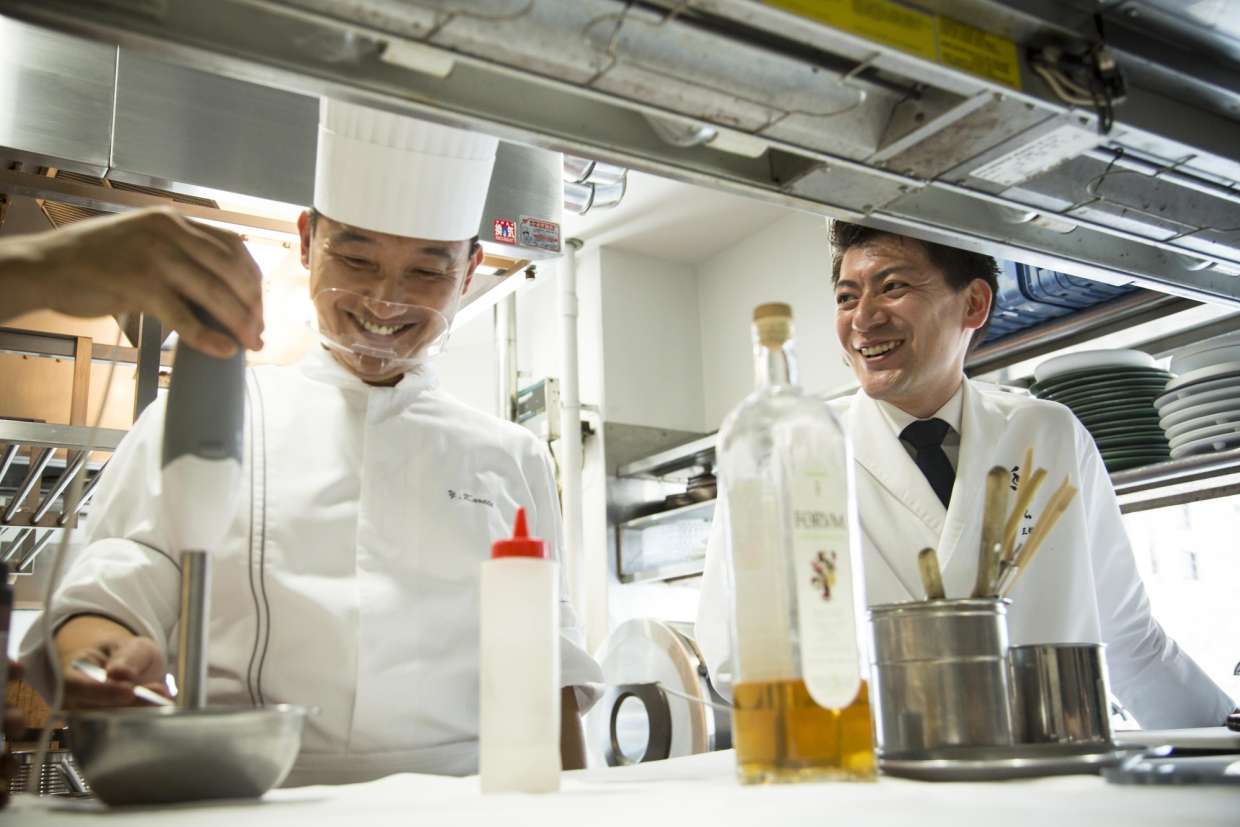 - 一度、旨みを出してから煮詰めるのは、フランス料理ならではの技でしょう。ベースをきっちり作るのです。そのルーツは、故・ベルナール・ロワゾー氏による「キュイジーヌ・ア・ロー(水の料理)」にあります。日本では、「神戸北野ホテル」の山口 浩総料理長も提唱されています。バターや生クリームを使わないため、旨みのある液体を煮詰める。他には、フライパンで肉や魚を焼くたびに、鍋底のエキスを水で溶かして(デグラッセ)ソースのベースを作ることも多いです。それらが同時並行に進む調理場はまさに、戦場ですよ。