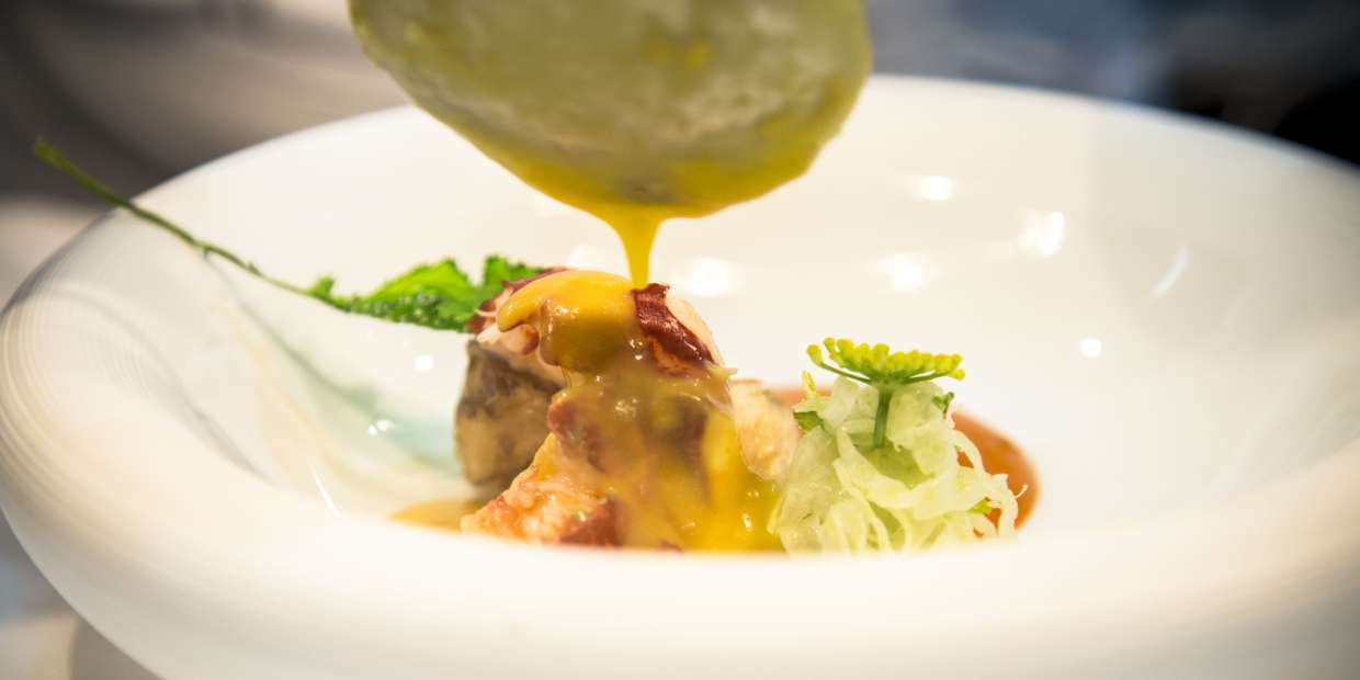 - オマールブルーの身はぷっくりしていて甘いです! 黄色い野菜のブイヤベース風ソースが放つ、トマトの爽やかな風味と、ブイヤベースの深いコクが馴染んでいます。