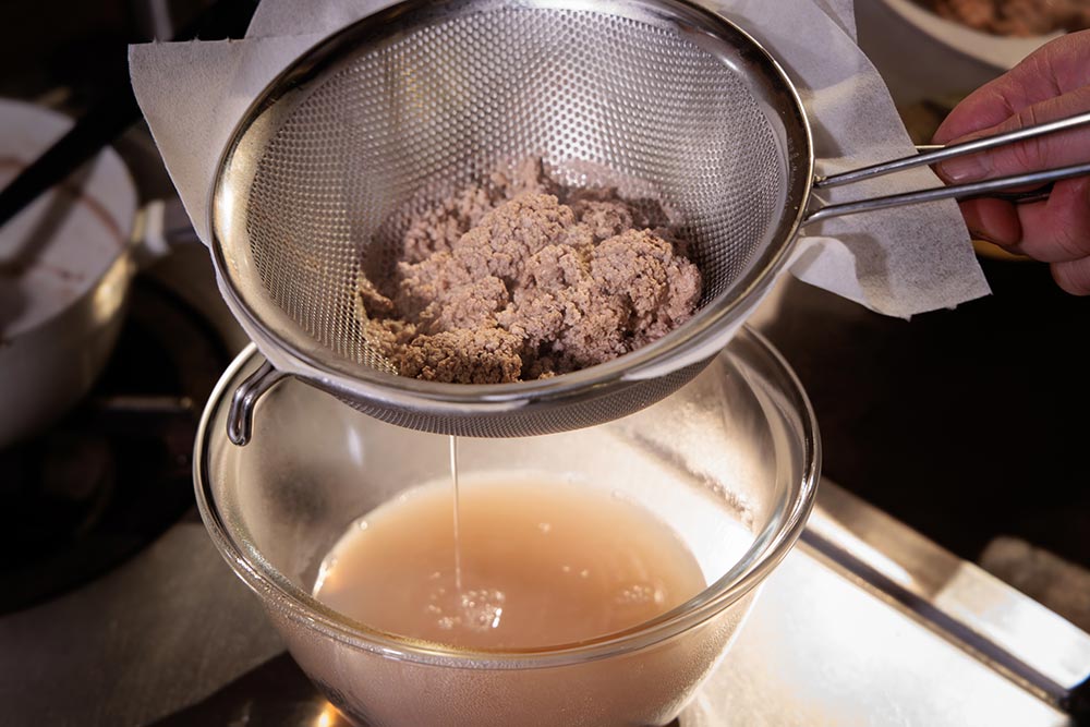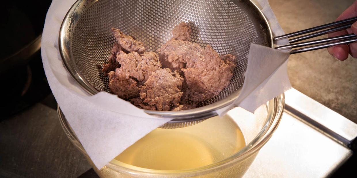 牛赤身ミンチ150gに昆布だし500mlを合わせ、ひと煮立ちさせてから弱火で5分抽出。キッチンペーパーを2枚重ねて、レードルで押さずに漉した。