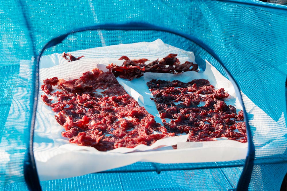 猪肉(左)、鹿肉は赤身のミンチを各200g使用。スチームコンベクションオーブンをオーブン機能・30℃に設定し、10時間乾燥。さらに干物のネットに入れ、5時間天日干しにした。猪肉は88g、鹿肉は90gになった。