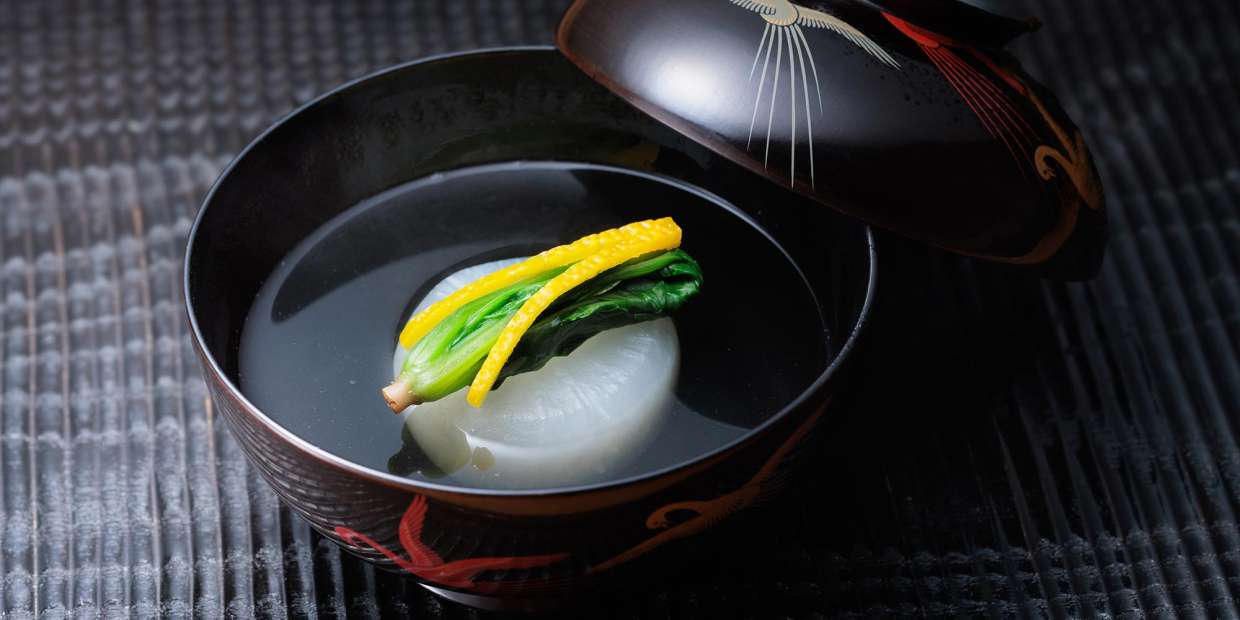「近年の害獣問題を考えると、これからの日本料理はもっとジビエを取り入れるべき」。東京・南青山『てのしま』の林 亮平さんは力説します。3回にわたって実験・検証した牛だしの成果をもって、最終回はいよいよジビエだしに挑戦。猪と鹿の干し肉でだしを引き、大根を椀だねにした極シンプルなジビエ椀を考案しました。農学博士・川崎寛也先生が瞠目したのは、清らかな野趣味。最後に、肉の香りをコントロールし、椀物向きのクリアなだしを引くロジックをお二人が総括します。