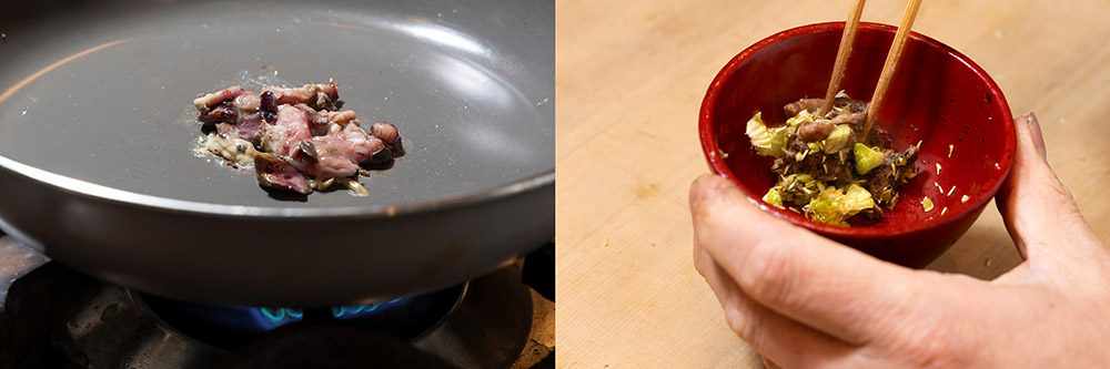 アマゴの肝をテフロン加工のフライパンで焼いて火を通す。生のフキノトウの中心部を刻んで混ぜ合わせる、