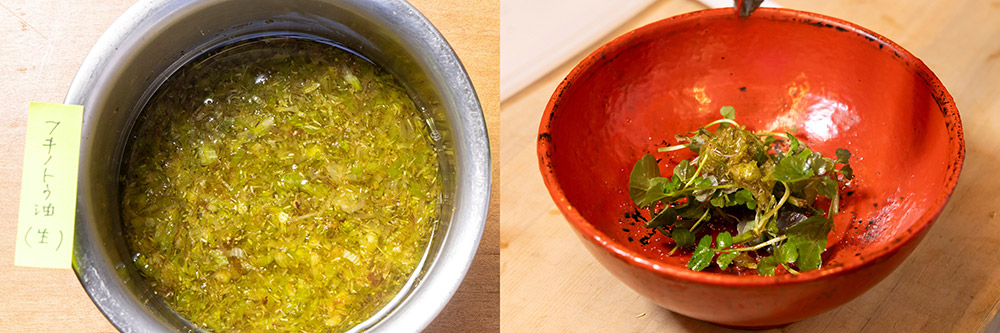 生のフキノトウを刻み、太白ゴマ油に1週間漬けた生フキノトウ油(左)を、漬けたフキノトウごとオランダガラシと和えた。