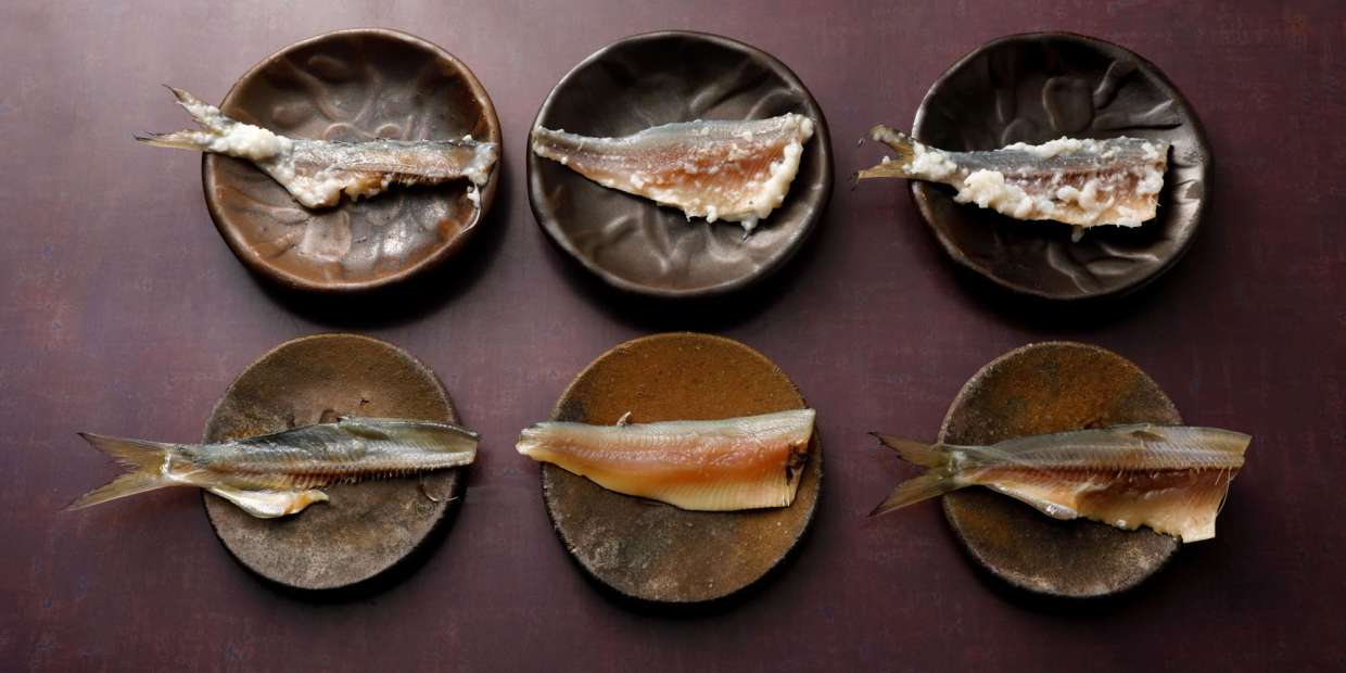 「鮒(フナ)ずしは骨ごと漬けているのに、なぜ骨が歯に当たらないのか?」。今回の実験は、魚料理をアテに地酒を楽しむ大阪の居酒屋『瑳(さ)こう』店主・田口尚孝さんのこんな素朴な疑問から始まりました。鮒ずしに代表される熟れずしは、塩漬けした魚をご飯に漬けて発酵させたもの。これを大阪湾で揚がるコノシロで試してみたいと田口さんは言いますが、「自然発酵は時間がかかるので、腐敗のリスクが心配で…」。そこで、農学博士の川崎先生が提案したのは、酢などの酸の力を借りて短期間で発酵の効果の一部をもたらす早熟れずし。「骨がある程度柔らかくなれば、鮎の背越しのような切り方でお出しできるかも!」と、お二人は大盛り上がり。なんと、2度の実験を経て、コノシロのフレッシュ感を残しつつ、骨の小気味よい食感も楽しめる早熟れずしが出来上がりました!