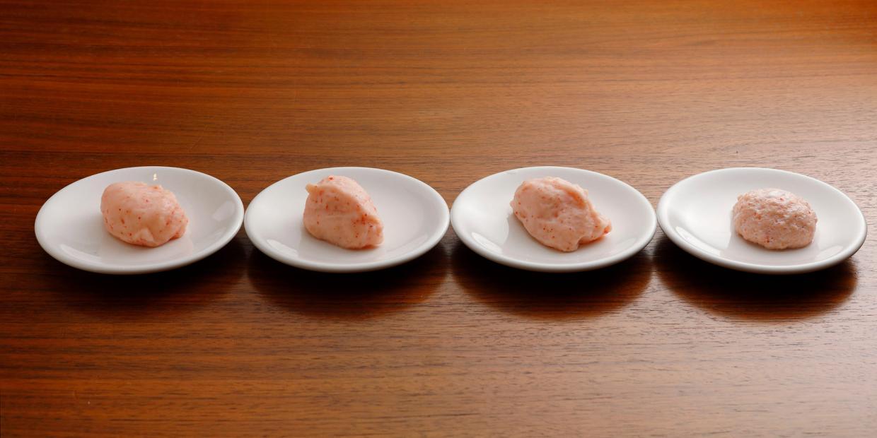 ふわふわ、ムチムチ、プリプリ…と、真薯は主役にする魚介によって、理想の食感は違います。vol.1では旬の鱧を使って、大阪・東天満の『懐石料理 雲鶴(うんかく)』店主・島村雅晴さんが農学博士・川崎寛也さんと共に、いくつかの実験を行いました。今回は、「エビ100%の真薯を作りたい」と島村さん。目指すは、柔らかさの中にエビらしい弾力も感じる真薯。鱧との違いはエビにある自己消化酵素で、これを生かすか? 阻害するか? そのために何を加えるか? vol.2は真薯における副材料について実験し、検証します。