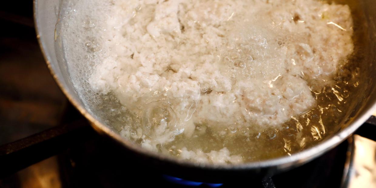鶏手羽をたっぷりの水と強火にかけ、すぐに浮いてきたのが茶色いアク。味見した2人はこの表情。