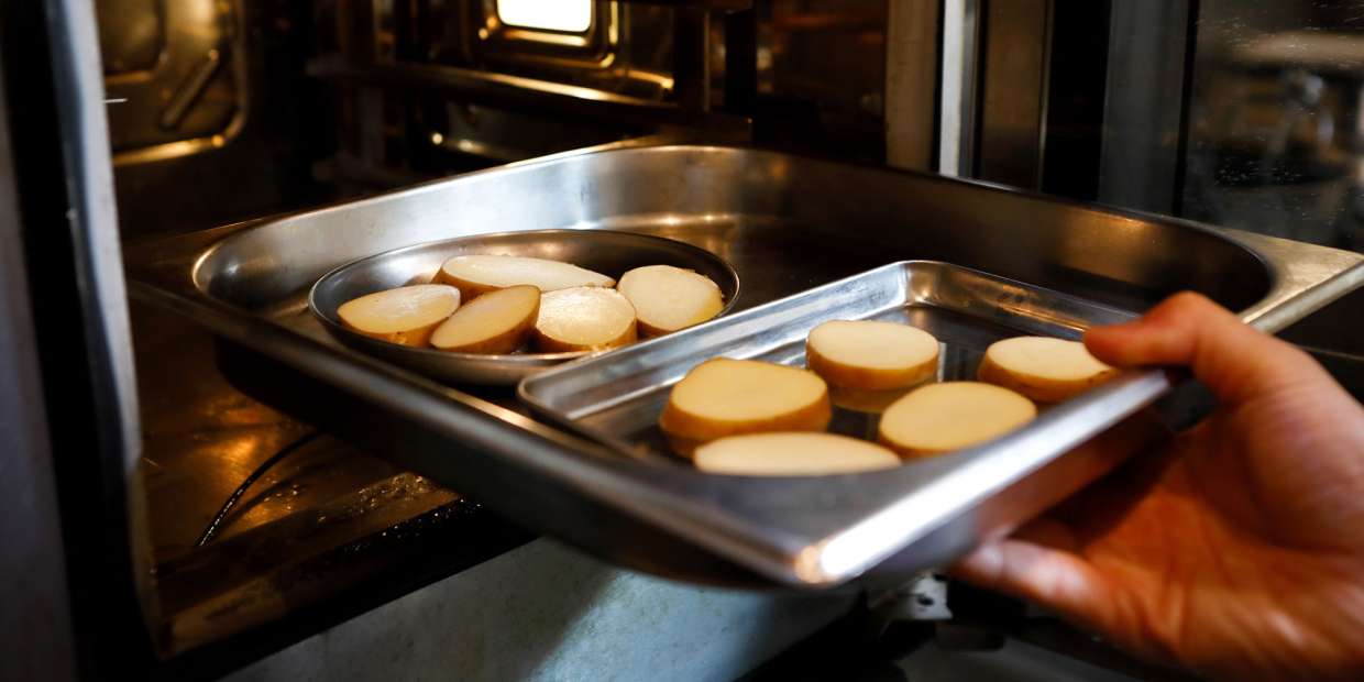 - ジャガイモを生食するとお腹を壊しそうですね。今回は、先生のアドバイスもあって、新ジャガ(メークイン)を65℃で12時間加熱しておきました。オーブン機能で焼いたものと、コンフィの2種を用意しましたので、食べ比べましょう。