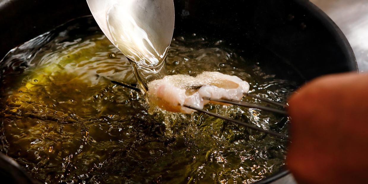 兵庫・甲陽園の『日本料理 子孫(こまご)』店主・藤原研一さんの鱧の火入れは、「皮を感じさせない」ことが信条。前回までは湯引きをテーマにお届けしましたが、今回からは秋鱧らしい加熱法を深掘りします。身と皮の食感のコントラストに興味津々の農学博士・川崎寛也先生と、一体感を大事にする藤原さんが、意外な火入れにも挑戦。後半は、油による加熱を実験・検証します。